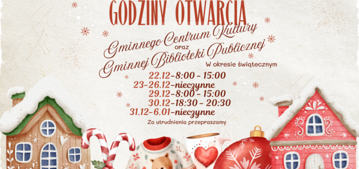 GODZINY OTWARCIA Gminnego Centrum Kultury oraz Gminnej Biblioteki Publicznej w okresie świątecznym 22.12 – 8.00-15.00 23 – 26.12 – nieczynne 29.12 – 8.00-15.00 30.12 – 18.30-20.30 31.12 – 6.01 – nieczynne
